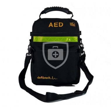 Naast ruimte voor de AED is er ruimte voor reserve elektroden, een reserve batterij-unit en andere benodigde accessories.De draagtas is gemaakt van stevig nylon, heeft een handvat en duidelijk reflecterende veiligheidsstrip.