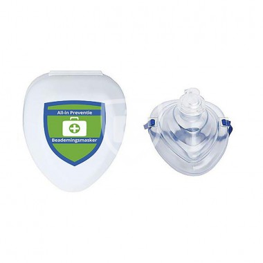 Dit beademingsmasker zit in een hard case, voorzien van eenrichting inblaasventiel met filter, elastiek en een gebruiksinstructie op de achterkant van de hard case.