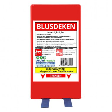 Blusdeken voor het doven van een beginnende brand en het inwikkelen van een persoon wiens kleding vlam heeft gevat. Deze blusdeken is 120 x 120 cm en wordt geleverd in een kunststof wandhouder.