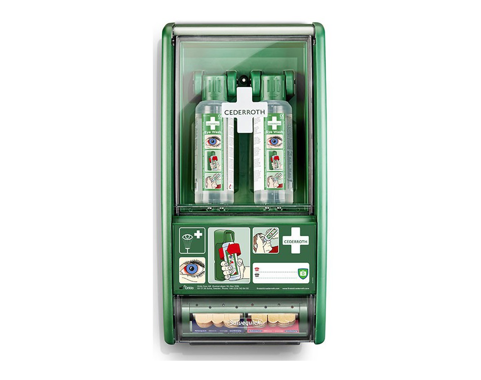 Compleet oogspoelstation met 2 oogspoelflessen en pleisterdispenser!