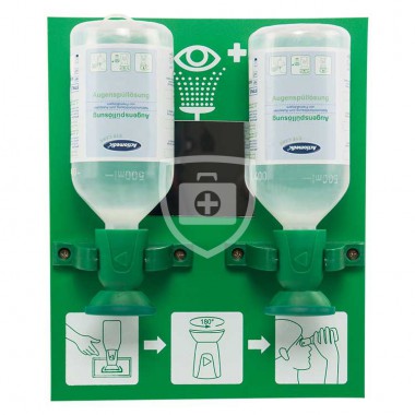 Actiomedic Eye Care design Oogspoelstation Double gevuld met 2 oogspoelflessen sodium chloride 0,9% van 500ML heeft een spiegel, stappenplan en biedt plaats voor een noodplan.