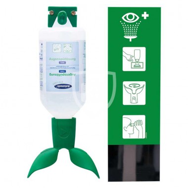 Actiomedic Eye Care design Oogspoelstation Double gevuld met 1 oogspoelfles sodium chloride 0,9% van 500ML heeft een spiegel, stappenplan en biedt plaats voor een noodplan.
